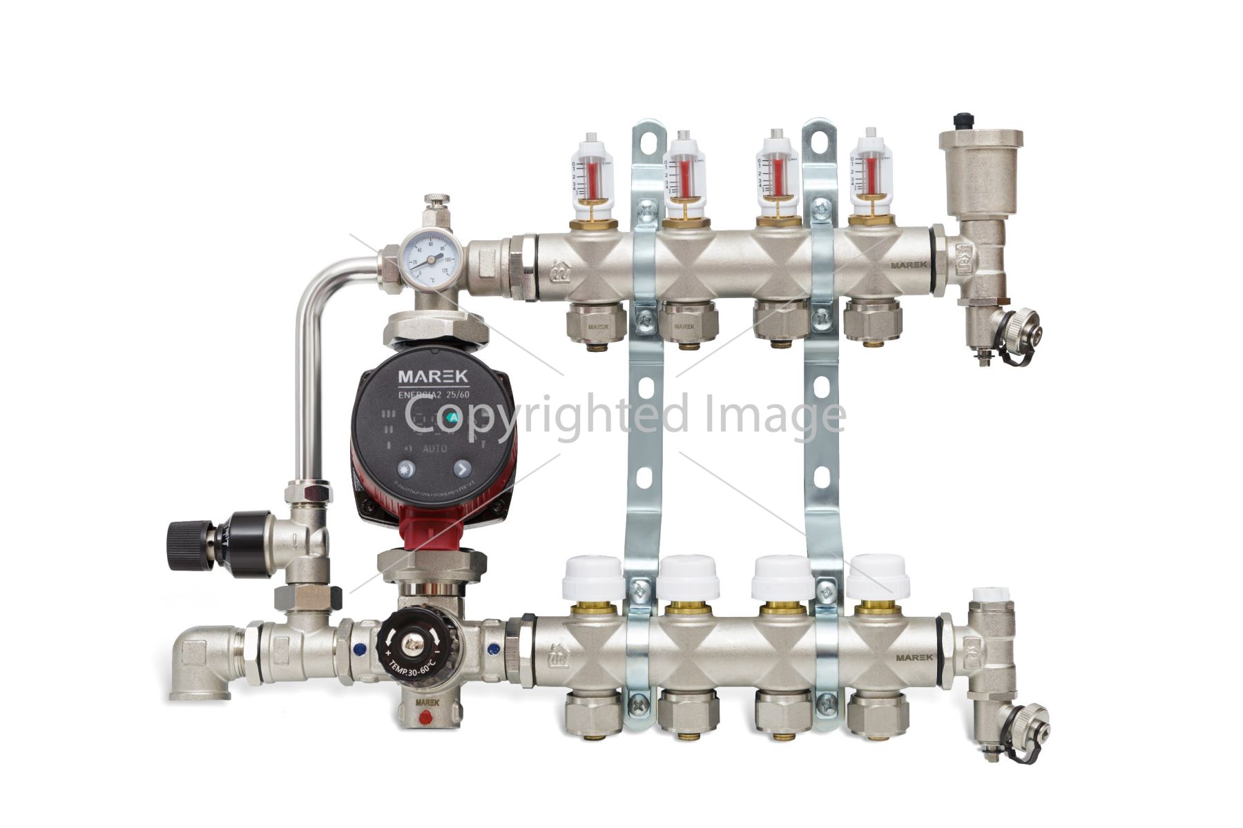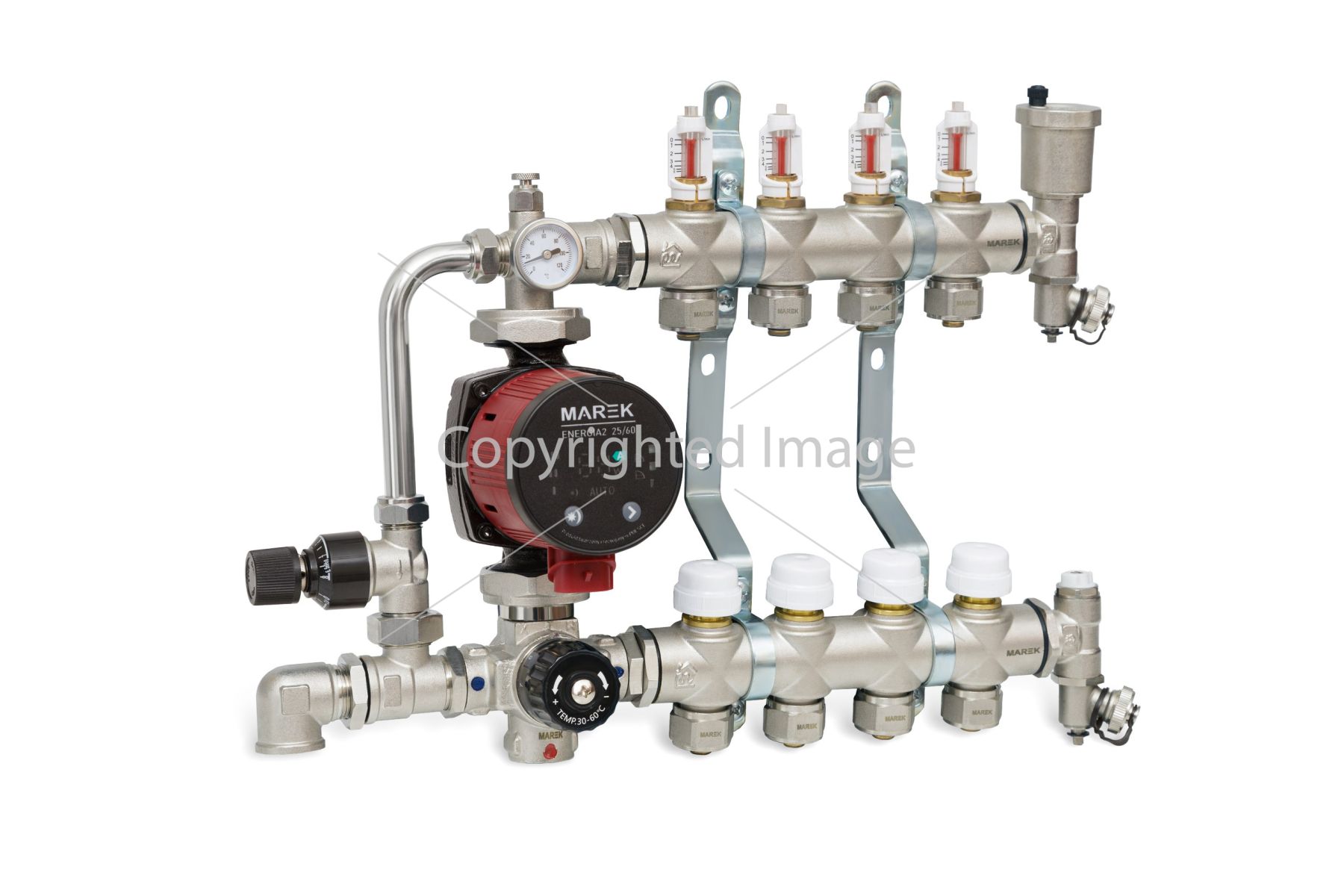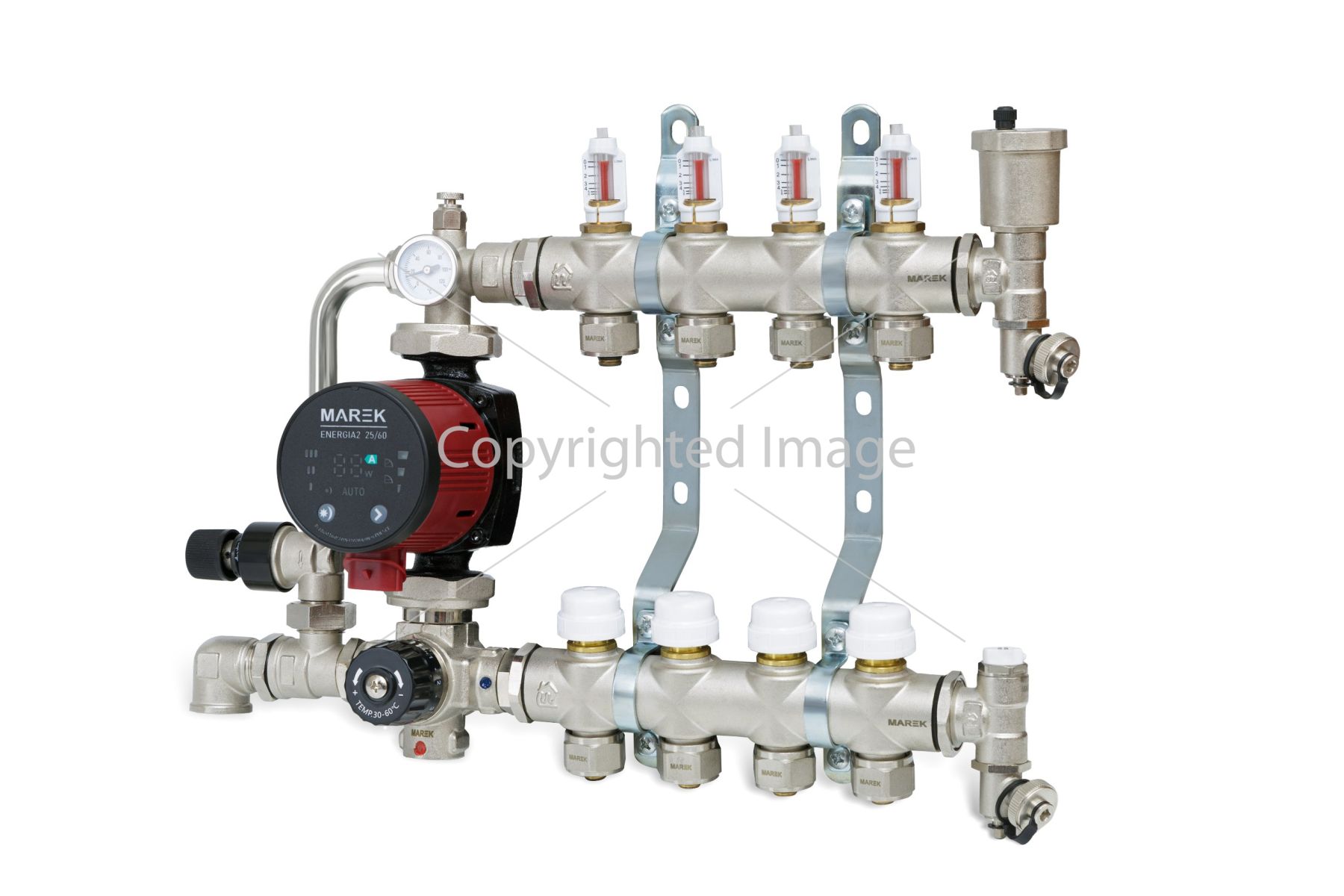 Колектор для теплої підлоги MAREK з витратомірами призначений для відокремлення температури теплоносія для «теплої підлоги» від температури основного теплоносія опалення та точного балансування витрати теплоносія в контурах опалення підлоги. Головна перевага в тому, що це можна зробити самостійно, не звертаючись до фахівця. У місцях входу або подачі в колектор розташовані витратоміри, які показують, яка витрата кількості літрів за хвилину кожного з контурів. Колектори KР поставляються із вмонтованими витратомірами. Коли індикатор витрати, що знаходиться у витратометрі, рухається вниз, то на шкалі можна побачити значення кількості теплоносія, що протікає. Щоб відрегулювати потік у кожному окремому контурі, потрібно зменшувати потік вручну, повертаючи прозорий ковпачок за годинниковою стрілкою до досягнення потрібного значення швидкості потоку. Вирівнювання відбувається у місцях виходу (звороти), де знаходяться спеціальні вентильні крани, якими можна відрегулювати за допомогою відкриття чи закриття (збільшити чи зменшити опір) у кожному окремому контурі. Також на магістралі, що подає, знаходиться автомат "маєвського" і дренажний (зливний) кран. Усі колектори мають єдиний європейський стандарт з'єднання – євроконус. Євроконус ― це деталь, що з'єднує колектор з трубою. Кінцева група (зливна група) ― це деталь із повітряним клапаном та зливним кульовим краном. Регулюючий модуль (змішувальний вузол) – цей модуль застосовується в системі теплої підлоги для підтримки постійної температури подачі в контурах теплої підлоги та безперебійної циркуляції теплоносія, який можна плавно регулювати за допомогою термостатичної головки в межах від 20 до 70 °С. Циркуляція здійснюється за допомогою так званих колекторних насосів. Його потужність підбирається в залежності від кількості контурів та загальної довжини труби для теплої підлоги.